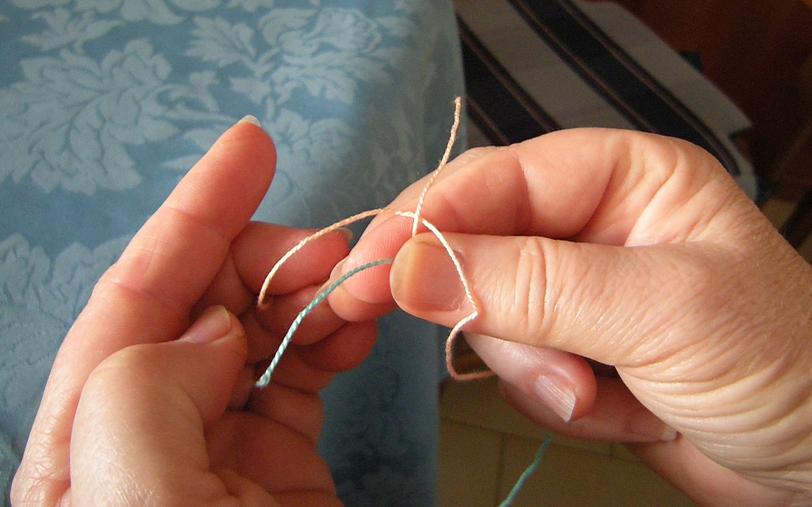 ...che viene subito tenuto fermo con il dito medio dietro l'indice. Passare poi lo stesso filo davanti al capo iniziale dell'altro filo (celeste, in questo caso), tenendo sempre il tutto stretto tra pollice ed indice.